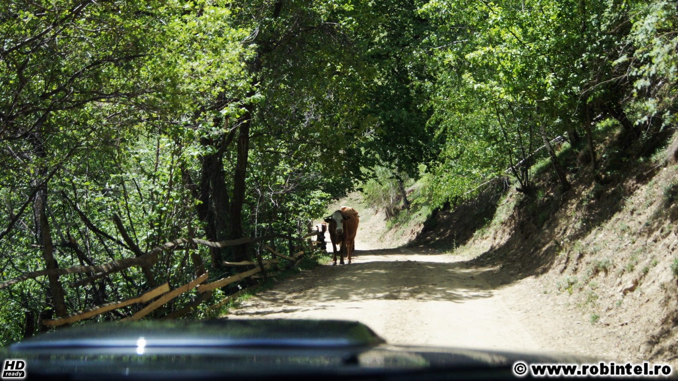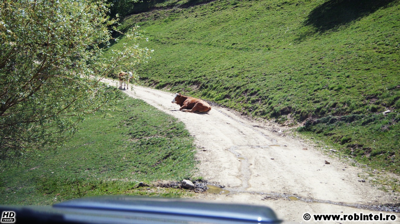 - Mi-a plăcut faza asta. Vaca din imagine dormea în mijlocul drumului și nu catadisea să se ridice, să ne facă și nouă loc. Un orășean ghibon ar fi claxonat, dar șoferul a mers frumos pe lângă, iar vaca n-a fost deranjată. Am numai respect pentru așa blândețe.