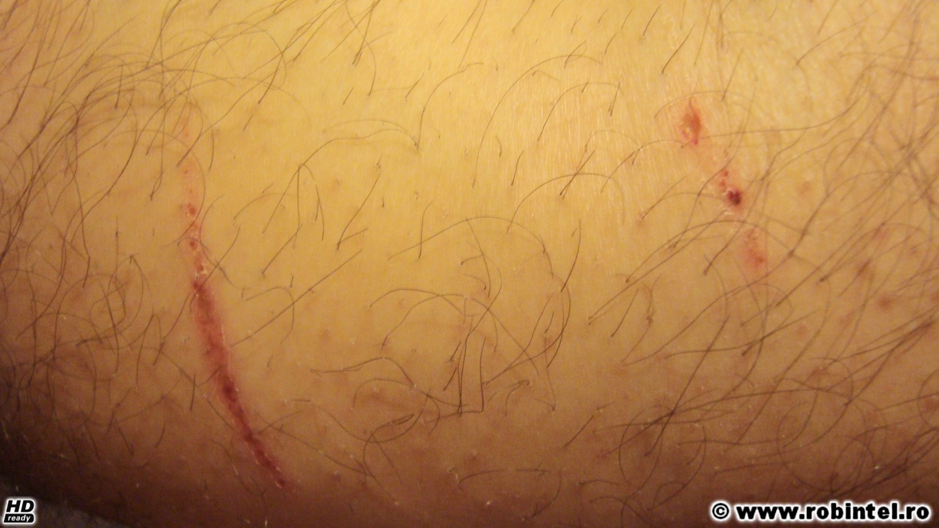 Și o poză. Două treimi din rana din stânga a trecut de piele, că fierul ăla ascuțit cam tăia, fir-ar ai dracului să fie ăia care l-au montat acolo.
