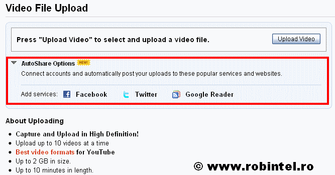 Cei de la Uoutube s-au gândit bine că e frumos să pună nişte opţiuni de partajare a filmelor (împărţire, distribuire) pentru servicii externe precum Twitter, Facebook şi Google Reader. Adică dacă urc un film pe Youtube celelalte servicii sunt notificate imediat. Ceea ce este mişto.