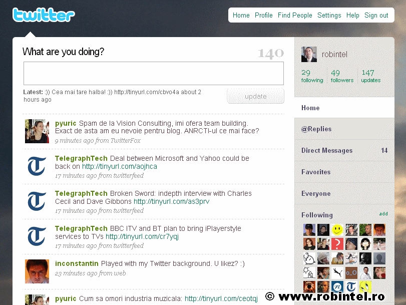 La cererea publicului cititor aveam astăzi un tutorial despre Twitter. Twitter este un site (vă rog să faceţi abstracţie de nivelul rudmentar al limbajului) prin care se pot schimba diverse informaţii cu o mare uşurinţă, iar conţinutul mesajelor îl determină fiecare, în funcţie de scopul urmărit.