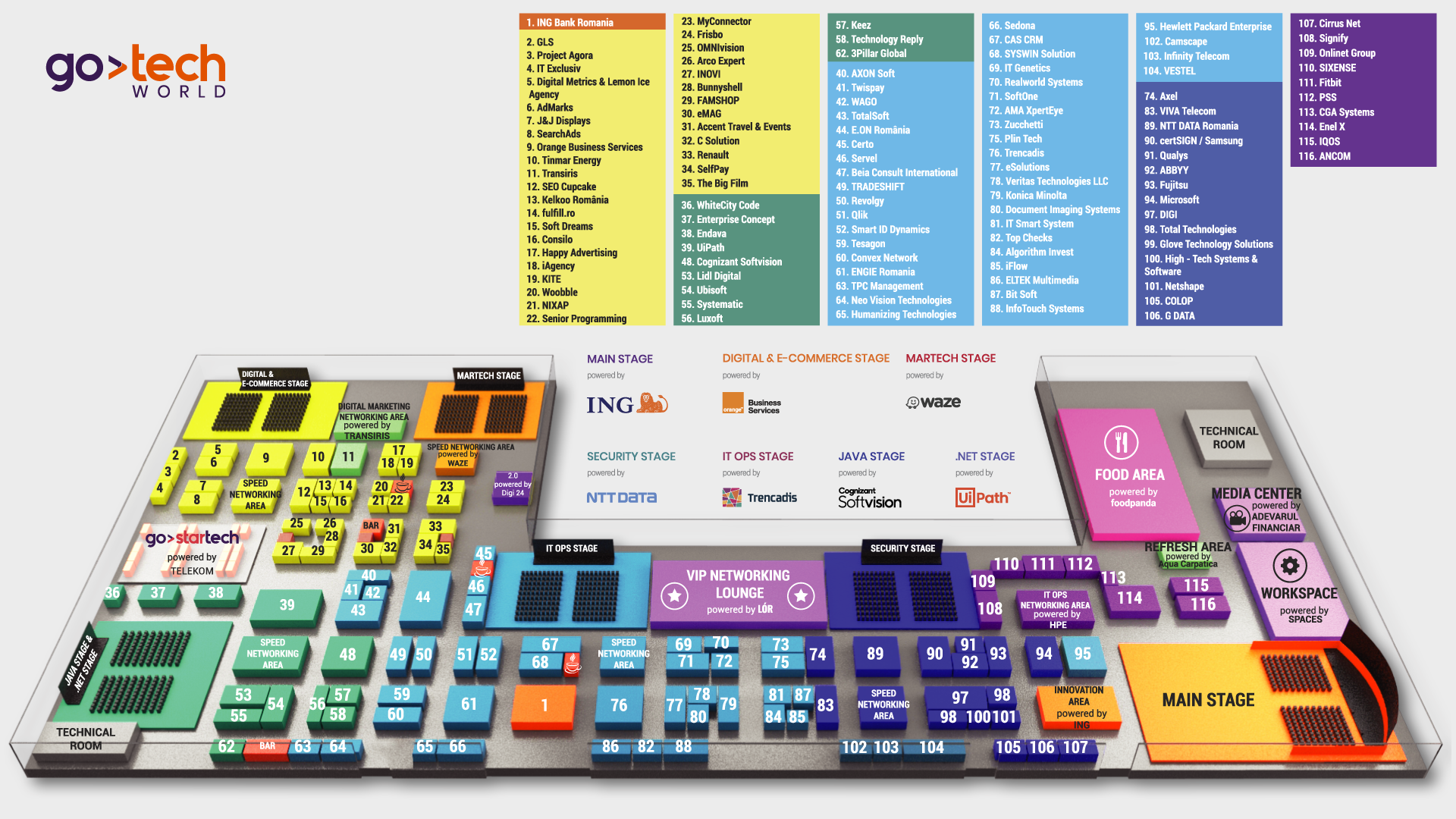 Participanții la ediția de anul acesta a evenimentului GoTech World vor putea descoperi și interacționa cu cele mai noi soluții IT și digitale de business vizitând cele 140 de standuri ale companiilor multinaționale și locale, pe o suprafață expozițională de 7194 mp.